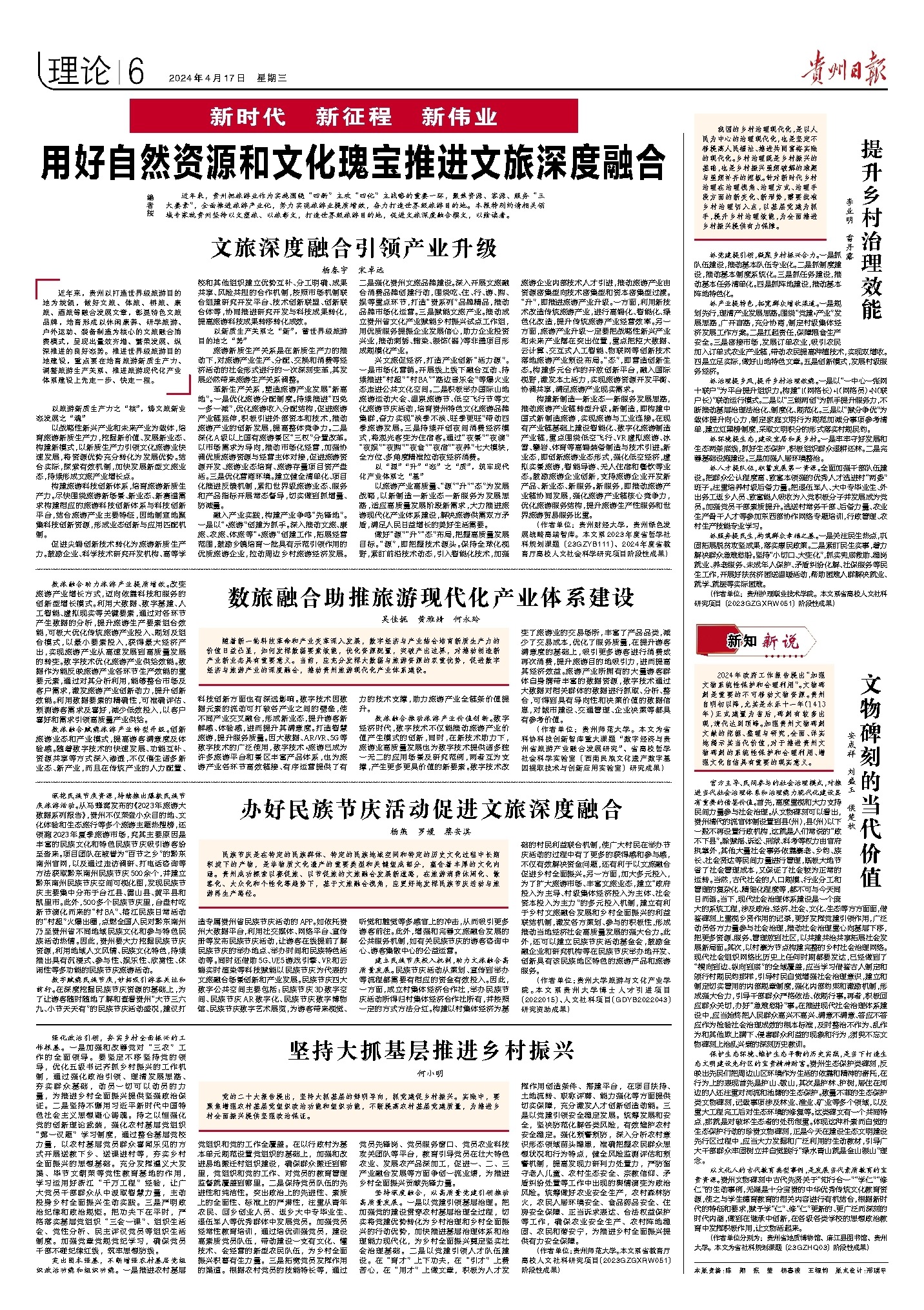公司2026年国际足联世界杯杨春宇教授受《贵州日报》邀请就贵州坚持以文塑旅、以旅彰文,打造世界级旅游目的地,促进文旅深度融合撰文。4月17日,《贵州日报》刊发了杨春宇教授的理论文章《文旅深度融合引领产业升级》。文章提出,要推进贵州省世界级旅游目的地建设,就要以旅游新质生产力之“核”,铸文旅新业态发展之“魂”;以新质生产关系之“新”,蓄世界级旅游目的地之“势”;以“源”“升”“态”之“质”,筑牢现代化产业体系之“基”;在旅游新质生产力的培育、旅游生产关系的调整、以及推进旅游现代化产业体系建设上要先走一步、快走一程。