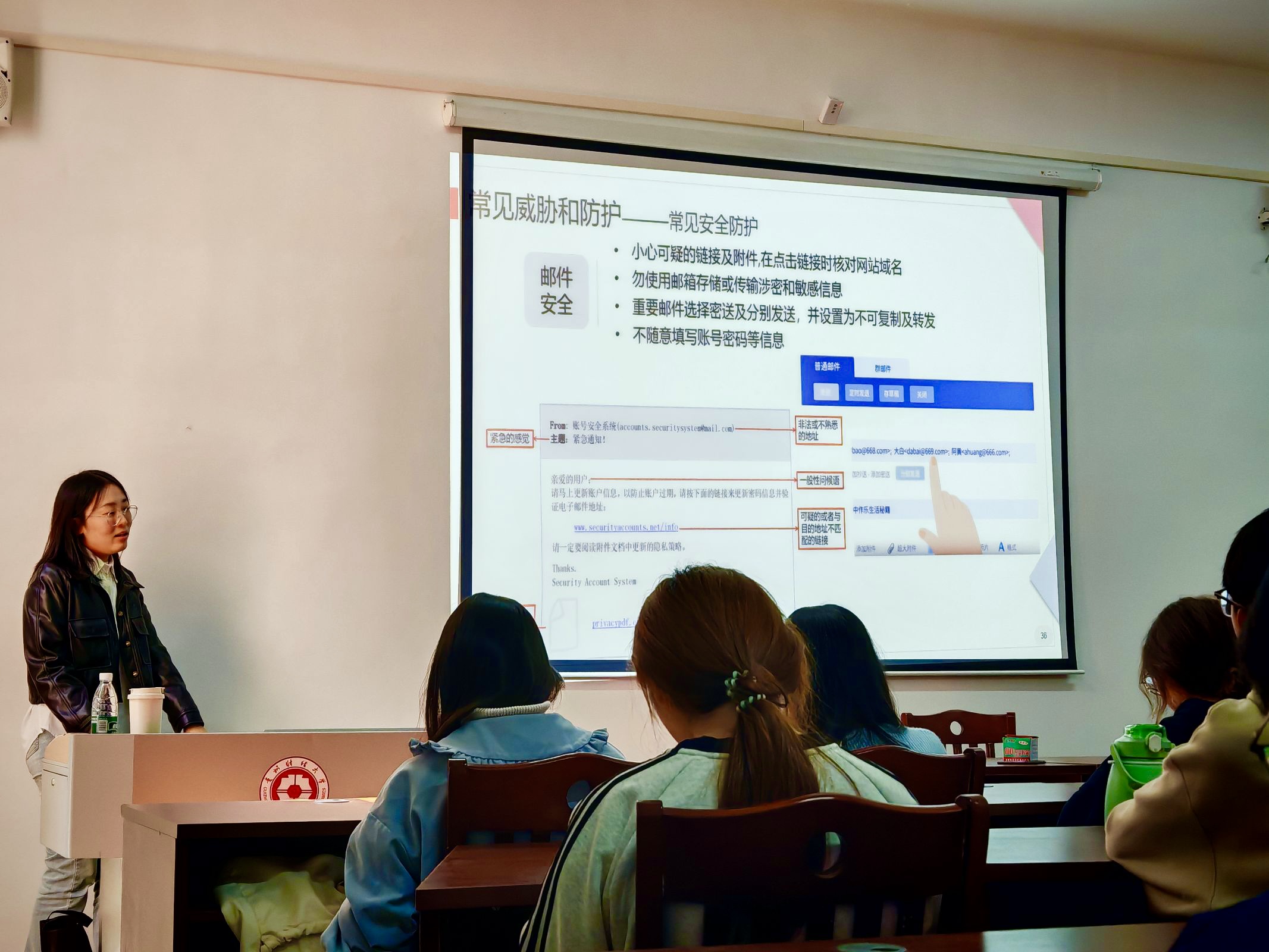 本次培训课程包括网络安全概述、数据安全、常见威胁和防护三个板块。在宣讲过程中,陈婉迪着重指出,国家以强制力保障公民、法人和组织的网络权利与安全,但与此同时,公民亦不得破坏网络安全,严禁利用网络损害国家安全、荣誉和利益,更不能开展任何违法犯罪活动。老员工置身于信息网络的潮流里,尤其需要提高警惕。同学们要注意防范个人信息的泄露,例如设置多样化且不重复的密码,对于带有个人信息的物品,务必在丢弃之前进行毁坏处理。当前,随着人工智能的兴起,AI换脸换声诈骗手段层出不穷。同学们不仅要自身提高防范意识,还要提醒身边的朋友和亲人,避免他们陷入网络诈骗的陷阱。