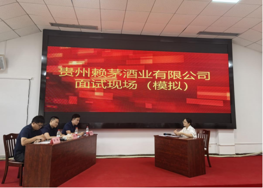 活动的下半场是高度还原求职现场的模拟面试环节。企业方派出了由罗元弟董事长、张杨经理、罗阳铭副主任组成的强大面试官阵容。毕业班员工何雁翎、谢杨杨、覃思杰、王美玲四位同学依次上场,接受了模拟面试大挑战。