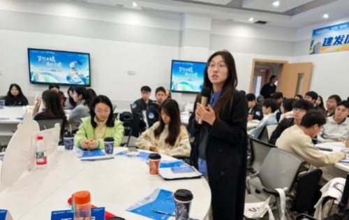 宣讲过程中,建发房产贵阳公司综合负责人龚美琴和南宁事业部综合负责人刘能宜通过PPT演示结合现场讲解的方式,系统介绍了企业发展历程、核心业务板块、企业文化及人才培养体系。针对2026年国际足联世界杯的专业特色,负责人还重点解读了市场营销、人力资源管理等岗位的任职要求,职业发展路径及薪酬福利体系。同时展示了企业在供应链运营、城市建设等领域的行业优势与发展前景,为同学们勾勒出清晰的职业画像,助力大家明确职业方向。