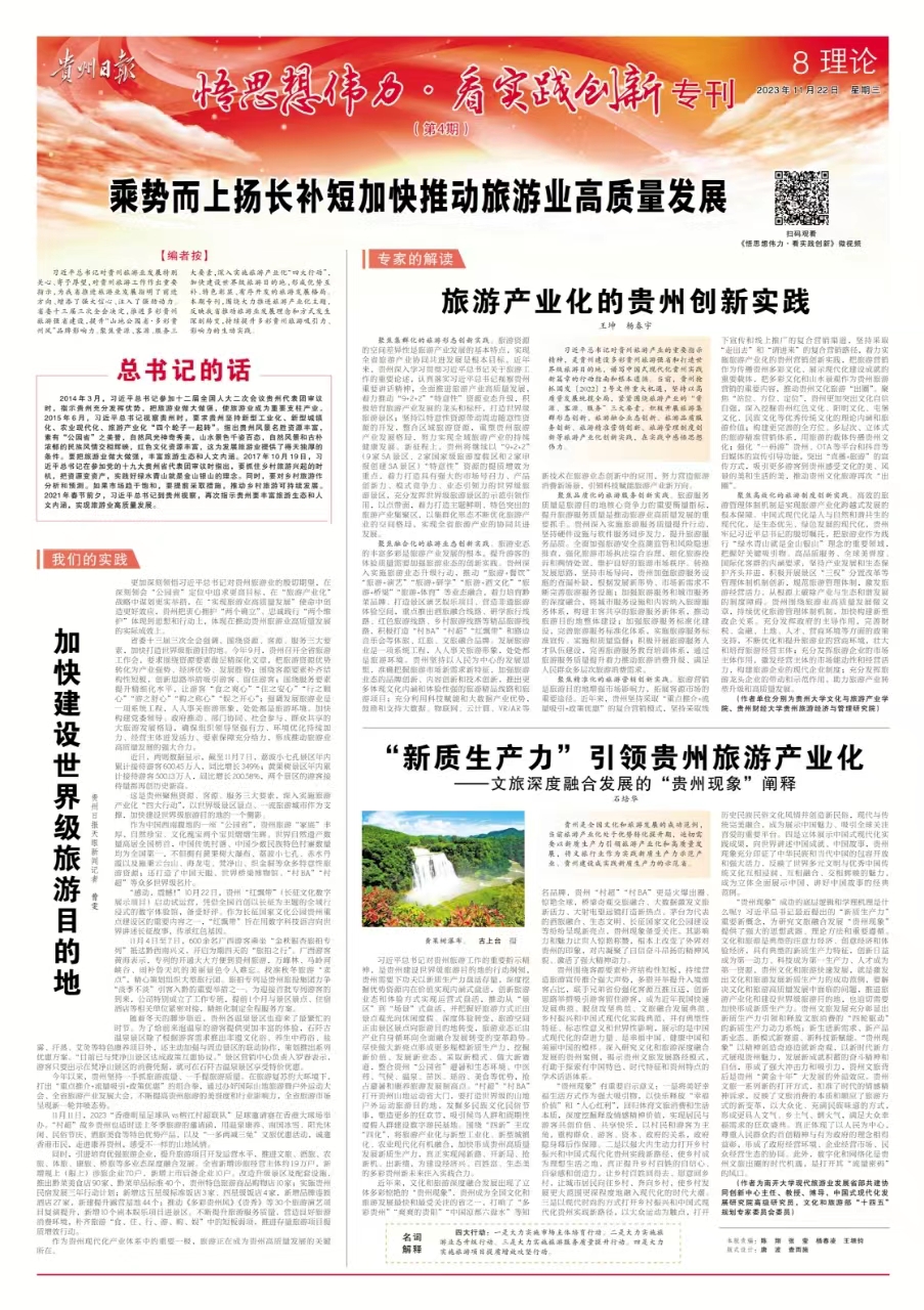 《贵州日报》近日刊发公司杨春宇教授合署理论文章《旅游产业化的贵州创新实践》