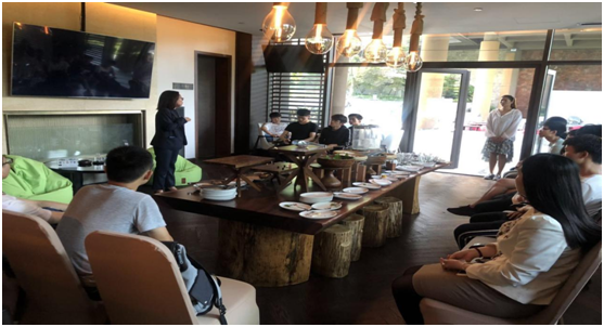 然后,在老师的带领下同学们到达了酒店的客服区,在这里大家被邀请参加来自泰国老师的舞蹈教学,同学们积极参加。最后,酒店的大堂经理跟大家进行了亲切交流,对酒店业的发展趋势、酒店的设计理念、先进的设施、特色等方面进行了阐述并耐心解答同学们提出的各种问题。