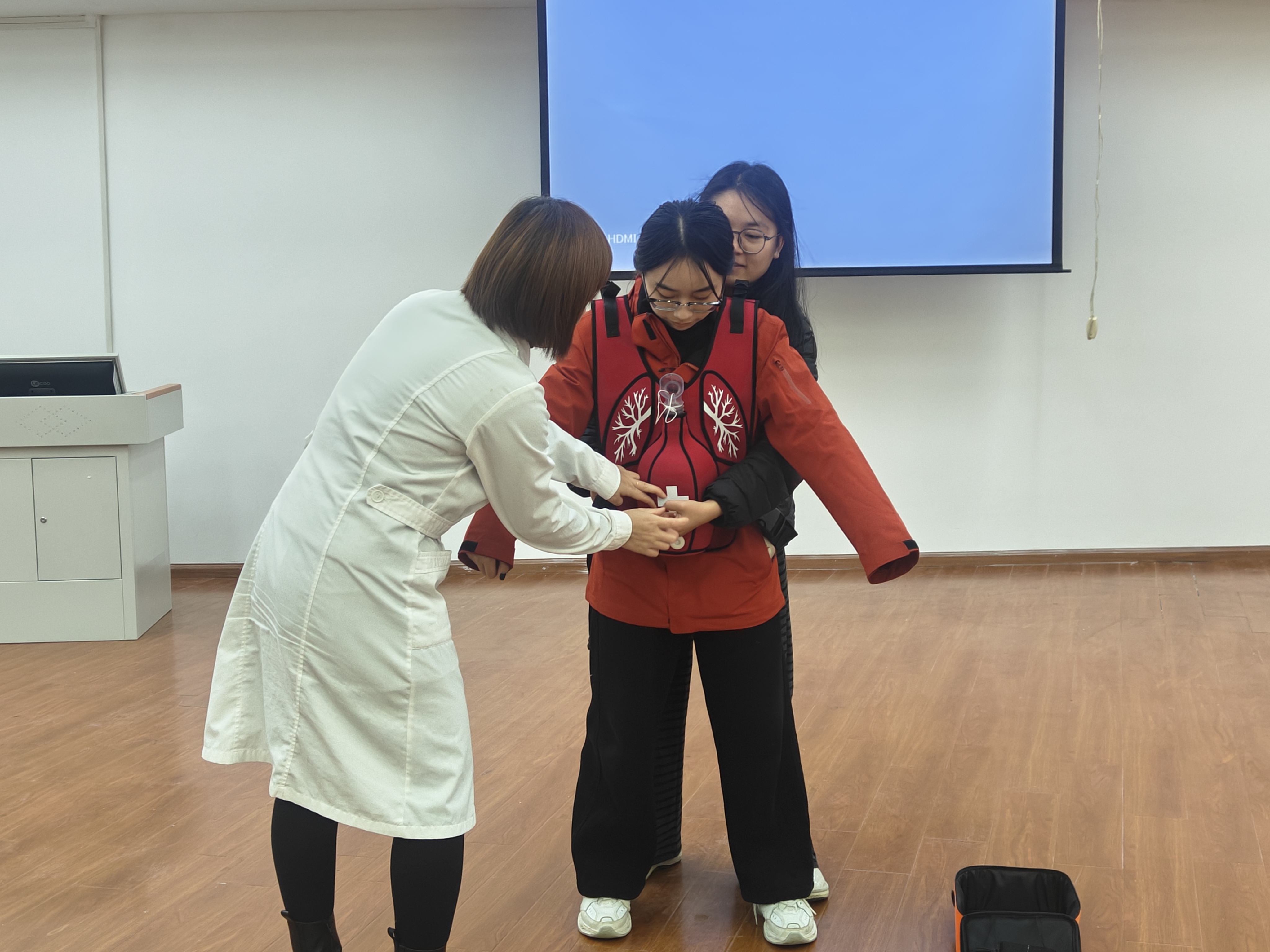 该活动特邀校医院的杨小川医生担任主讲人。杨医生主要从三个核心内容展开:一是“为什么要学习急救”、现场初级急救的重要性以及现场急救的基本内容,强调了黄金四分钟的宝贵性;二是以“心肺复苏(CPR)”为核心,详细讲解判断意识、呼救、寻求帮助、翻转体位、判断呼吸、胸外心脏按压、打开气道、人工呼吸、除颤等八个步骤,明确了心肺复苏的重要作用以及实用性;三是判断CPR的有效和终止情况,为生命救治提供科学指引。