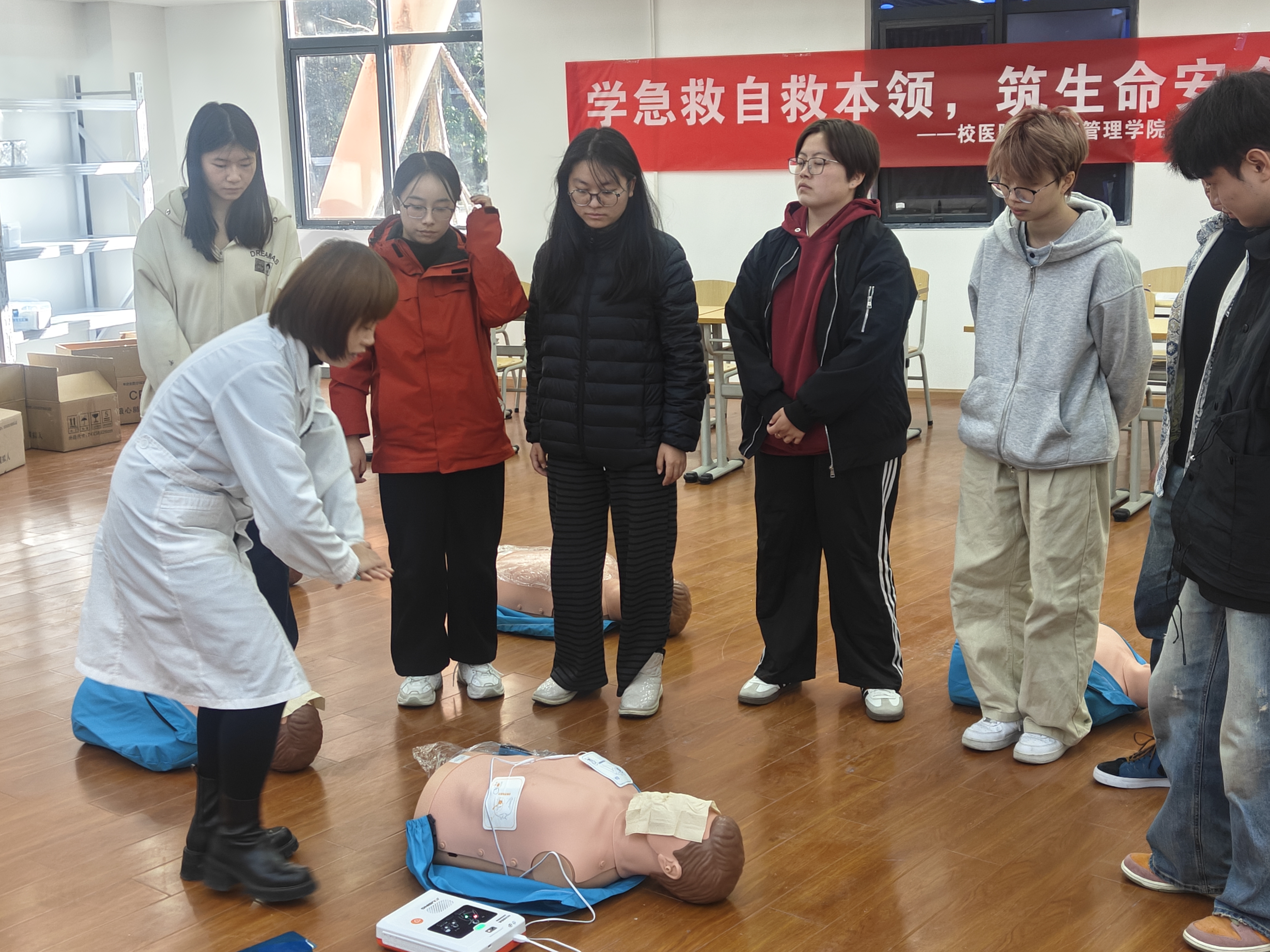 在实操环节中,为确保我们全部同学熟悉整个流程,杨医生亲自演示了除颤仪(AED)的操作方式,也针对“按压姿势不标准”“忘记观察胸廓起伏”等问题即时纠正,确保每一位同学能够独立完成一次完整的“急救”。通过该环节,同学们巩固了急救的日常知识,掌握了急救的基本操作。