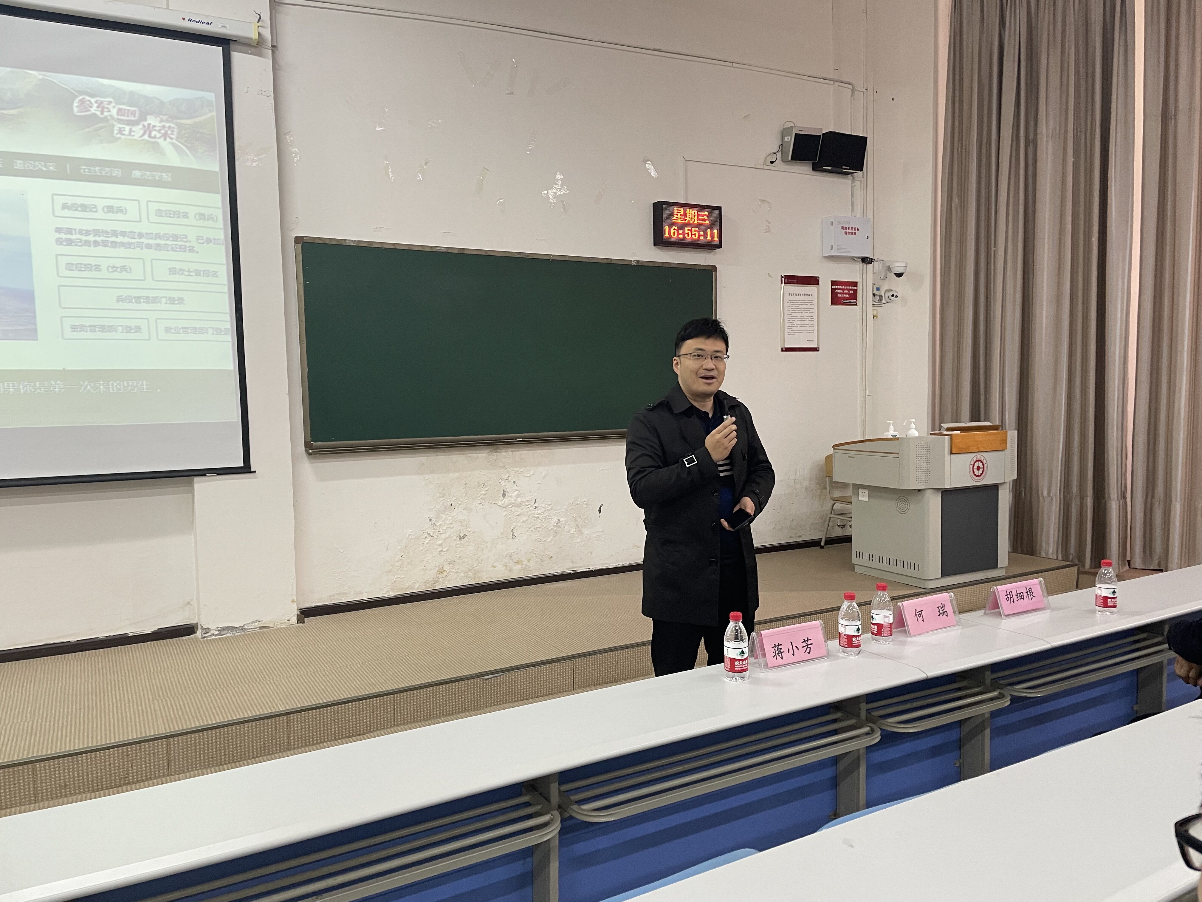 首先由武装部胡细根老师进行宣讲,胡老师提到:第一,在身体素质和政治条件允许的情况下,积极鼓励同学们去参军入伍;第二,作为一名军人我们既可以发展个人素质也可以实现自身价值,报效祖国;第三,现在国家对于参军入伍的同学的福利和政策一直在不断的提高,大家要积极响应国家政策,努力把握机会。