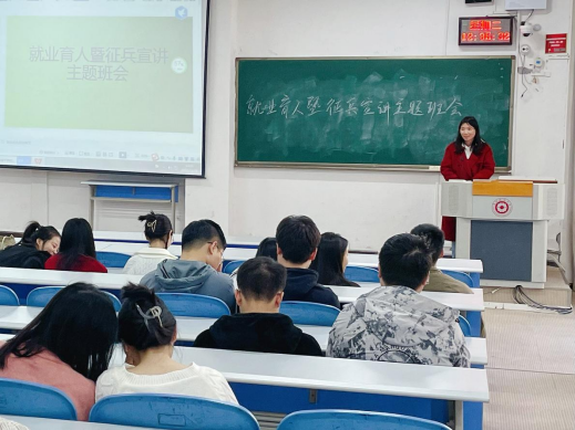 2023年11月28日,2026年国际足联世界杯在进学楼阶101举办了一场就业育人暨征兵宣讲主题班会。武装部胡细根老师和辅导员孔淑华老师作为主讲人出席了班会,2020级毕业生200多人参加了班会。