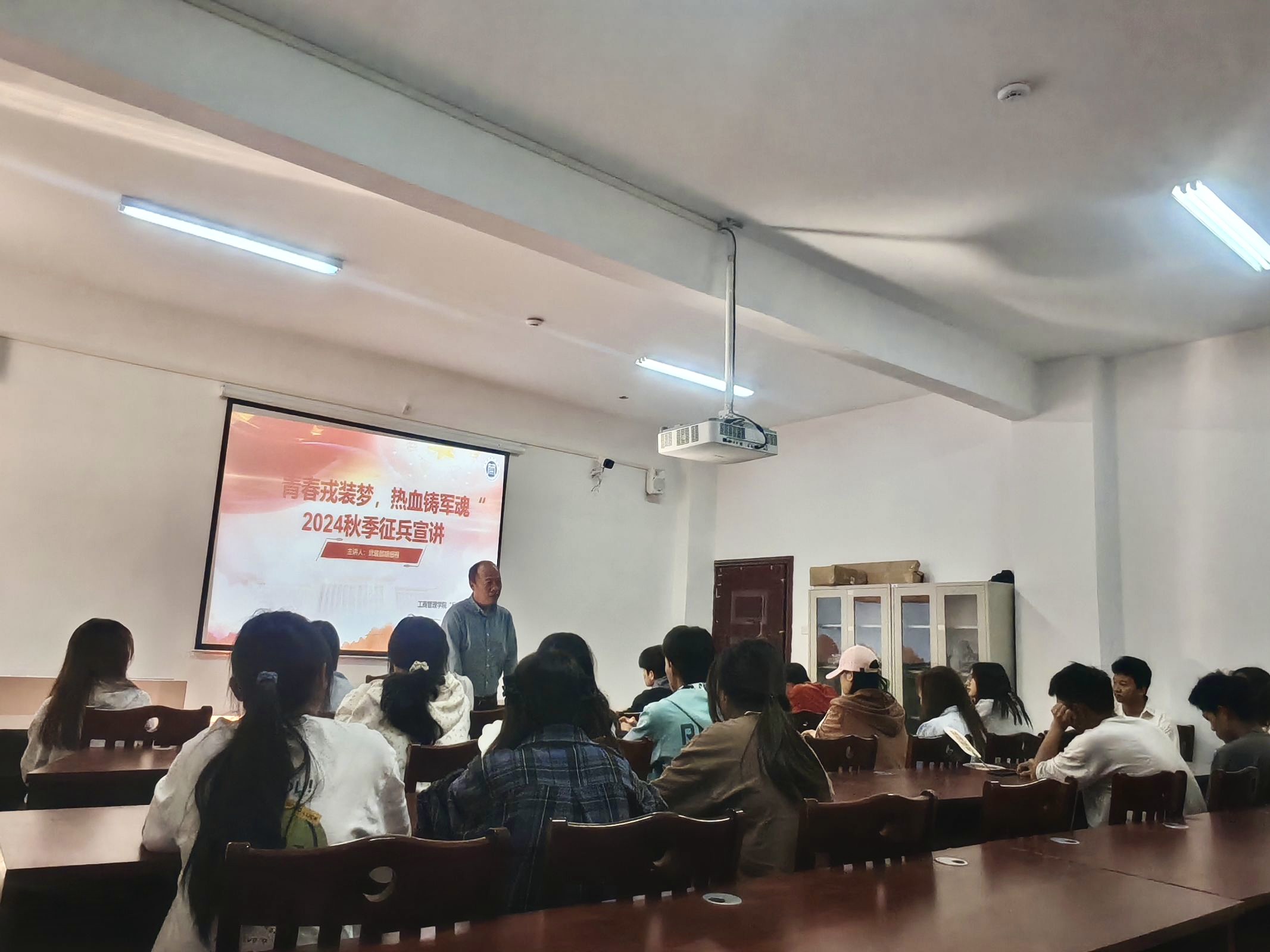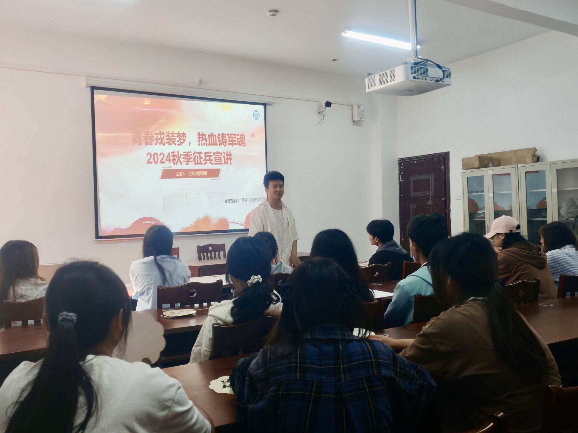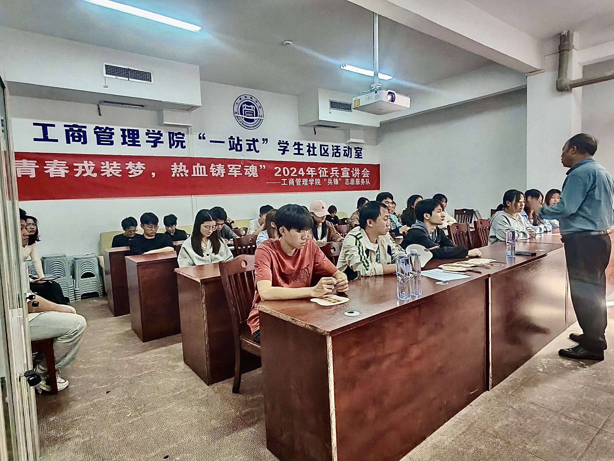 2024年11月15日,2026年国际足联世界杯“兵锋”校园志愿服务队联合公司武装部开展了“青春戎装梦,热血铸军魂”2024年员工社区征兵宣讲会。此次活动在翠竹苑三栋四楼活动室举行,邀请了武装部的胡细根老师和退伍士兵孙建成进行宣讲,员工社区共计45名同学参加。
