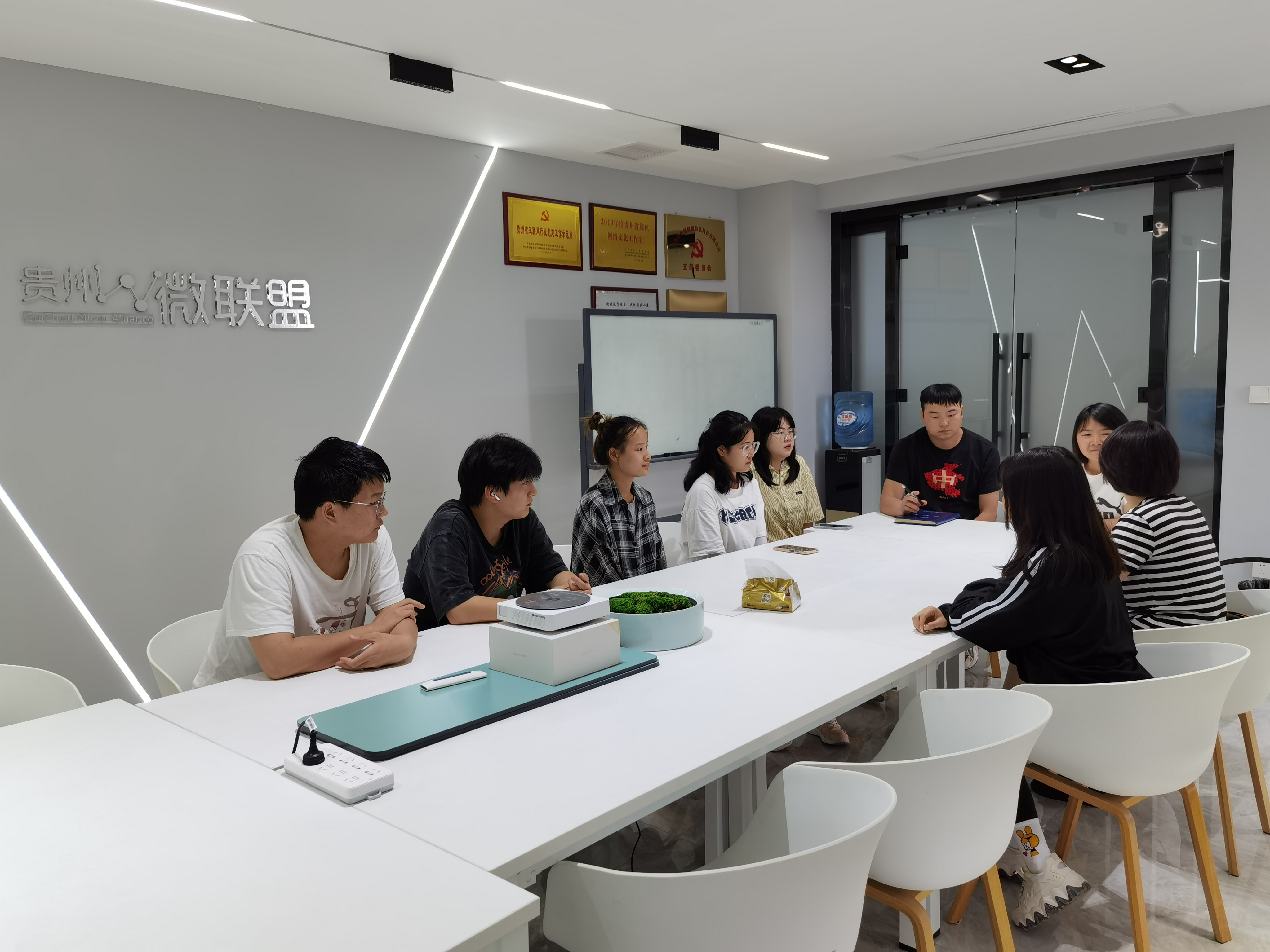 毛菁菁与贵州微联盟党支部书记张兴瑞和贵州微联盟联合创始人、内容总监余萍女士以及本组的六位实习生进行了交流,在交流中,实习生的表现得到了实习单位的认可。同时,实习生也讲解了她们在这一周的实习经历与收获等,实习生表示,通过专业实习,学以致用,实践能力和创新能力得到一定的锻炼,综合素质得到全面提升,同时也发现了理论知识和实际工作经验的欠缺,明确了今后努力的方向,为顺利就业打下良好的基础。
